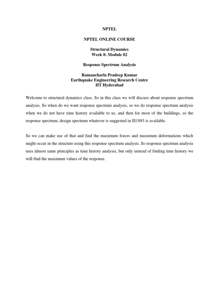 Nptel Nptel Online Course Structural Dynamics Week 8: Module 02 Response Spectrum Analysis Ramancharla Pradeep Kumar Earthquake Engineering Research Centre IIT Hyderabad | Normal Mode | Eigenvalues And Eigenvectors